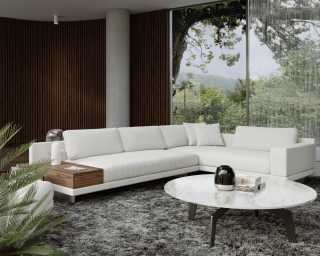 Compelling in its simple yet cutting edge style, the Dresden modular collection is a bold take on contemporary design. The sleek, low profile frame is met with grand cloud-like seat cushions to create the statement making structure. The Dresden also balances the expansive seating with an interchangeable side table insert that is offered in walnut, natural, and white lacquer finishes. Grounded on cast stainless steel legs with an elegant brushed finish, this piece's thoughtful composition demonstrates an exceptional opportunity for modern luxury in your home.