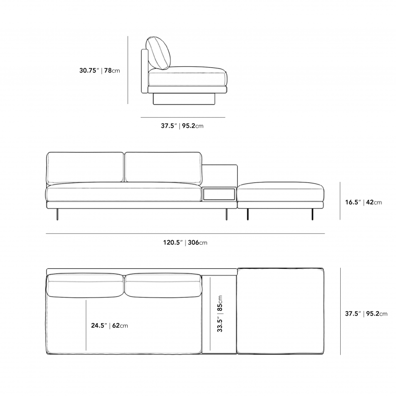 - Includes 1 armless sofa with walnut storage table, and 1 ottoman