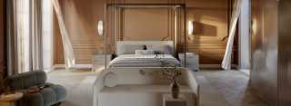 Step into a sanctuary where timeless architecture meets refined modernity. The Nerva Bed, framed by a sculptural canopy, anchors the space with quiet grandeur. Flanked by minimalist nightstands and bathed in natural light, it embodies a serene balance of form and function. The room’s warm paneling and soft textures invite a slow, intentional pace — a true retreat from the everyday.
